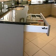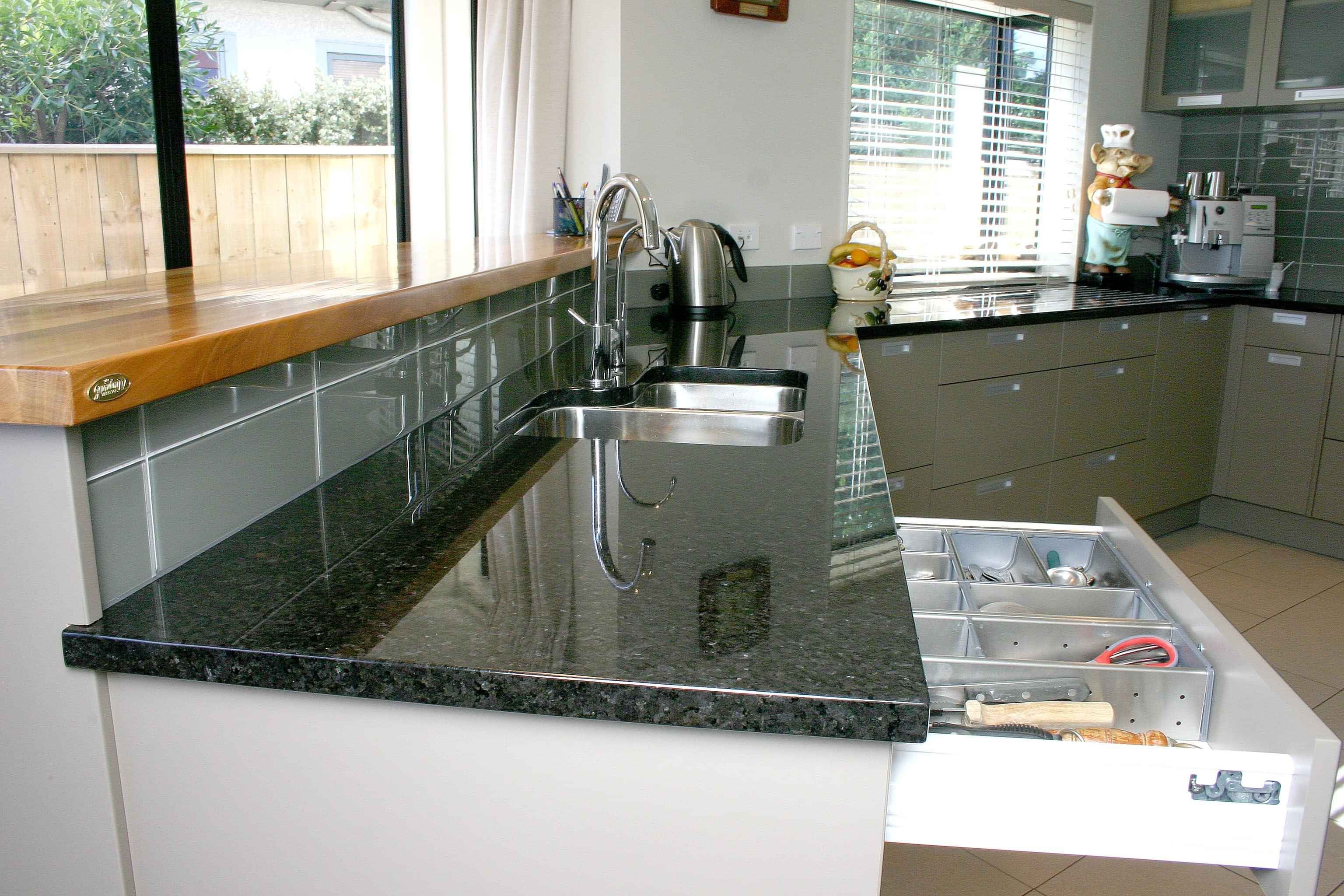 Our clients for this kitchen were a professional couple who purchased this existing home, overlooking Kapiti Island. Large floor to ceiling windows to capture the views are a feature of this charming home. The kitchen was small, limited pantry space, generally poor layout. The brief was to create more benchtop area, and to provide much needed storage areas, thereby creating a kitchen that was more workable for this busy couple. The theme for this kitchen was contemporary in neutral colours, and black. Granite benchtops with accents of Kauri timber in the bartop compliment the magnificent backdrop of Kapiti Island. The sink insert, which was originally housed by the window, has been installed into the island to include the owners in conversation. The raised 'Innovations Black Corrugate' panel back complimented the 'Black Labrador Granite' Benchtops. Due to extensive alterations of this home the end result is a kitchen which now not only is practical, with more workable spaces; it also reflects its surroundings - inside and out.